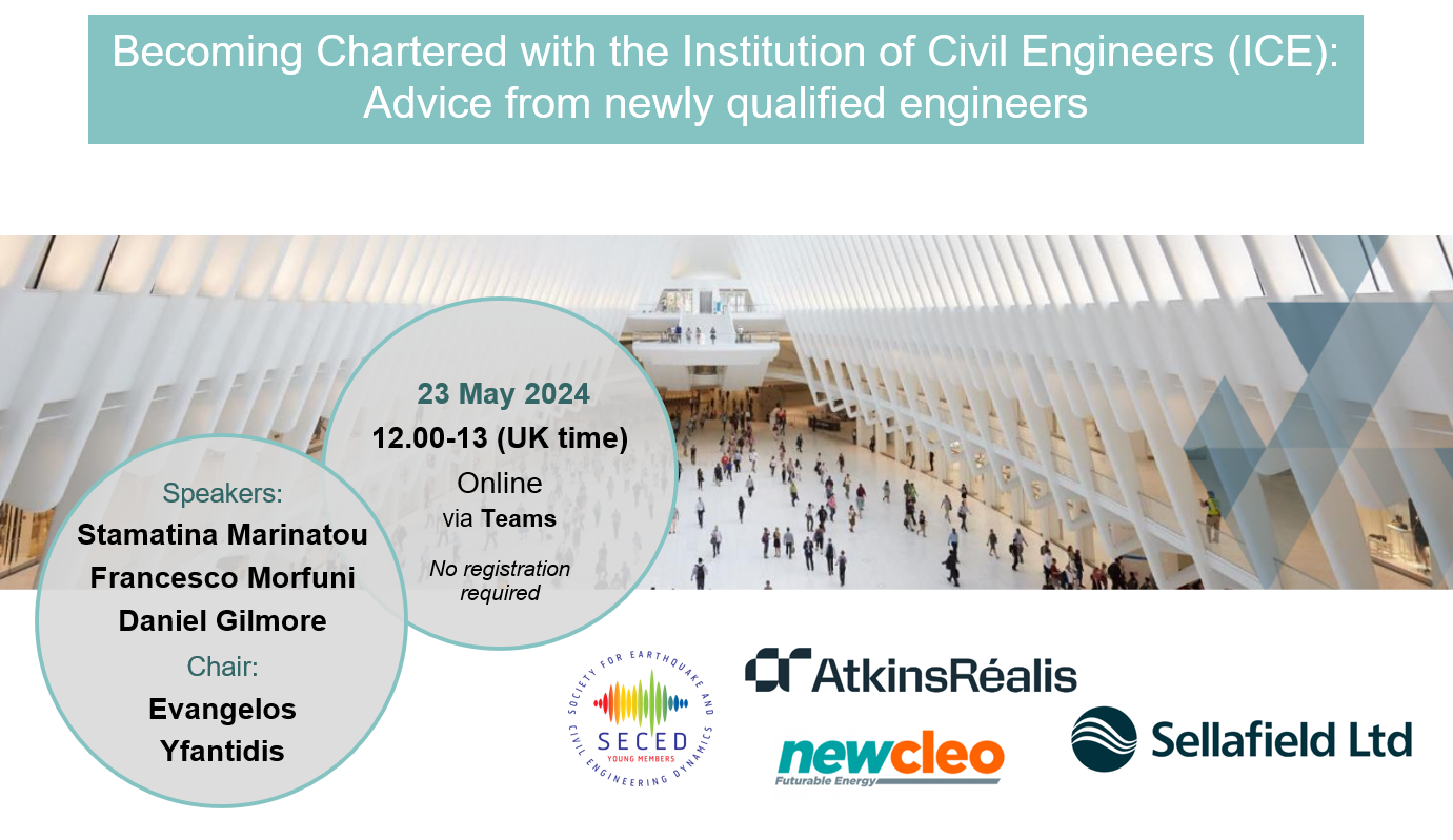 The SECED Young Members Sub-Committee (YMSC) has invited Stamatina Marinatou (AtkinsRéalis), Francesco Morfuni (newcleo) and Daniel Gilmore (Sellafield Ltd) to provide guidance on how to become a Chartered Engineer (CEng) with the Institution of Civil Engineers (ICE).